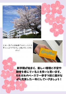 ↑画像からPDFでご覧いただけます。 〇5月の行事予定 1日(金) 身体測定・体力テスト 7日(木) 心臓検診(高1) 9日(土) 土曜課外(高3) 12日(火) 総合型受験ガイダンス(高3) 13日(水) メディア講習会(高1) 14日(木) 内科検診(高1) 15日(金) スクールカウンセラー来校 16日(土) PTA総会(登校日) 18日(月) 16日代休 26日(火)~29日(金) 第1回一斉試験 27日(水) バイク講習会