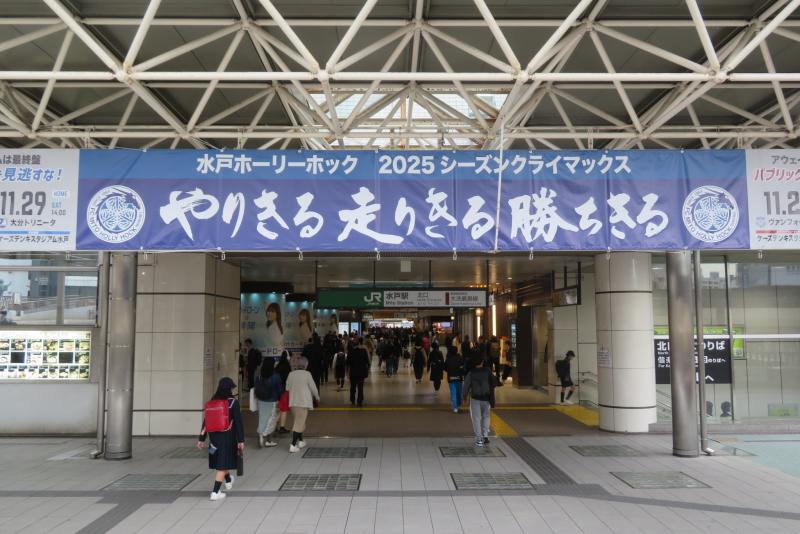 令和7年11月20日まで期間限定で、水戸駅北口の玄関上側に、3年2組の和田虎也さんが筆で書いた水戸ホーリーホックのチームスローガン「やりきる 走りきる 勝ちきる」が掲示されています。駅近くにお立ち寄りの機会がある方は、ご覧いただければ幸いです。