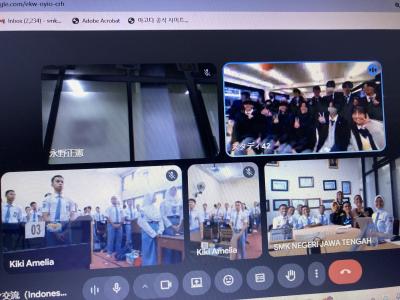 SMKN JawaTengahの生徒さん6名とSMKN 7(スマラン第7専門高校)35名の生徒さんとオンラインで交流しました。日本語の授業に接続していただき、お互いの文化や学校生活について聞いたり、学んだり、インドネシア語も耳にするなど関心を膨らませながら交流する、興味深い経験となりました。本校からは附属中生も合わせて26名が参加しました。インドネシアの高校生からは「生徒会活動」「授業で学ぶ教科」「部活動」に対する質問が多かったようです。最後はスクリーン上で記念撮影です。